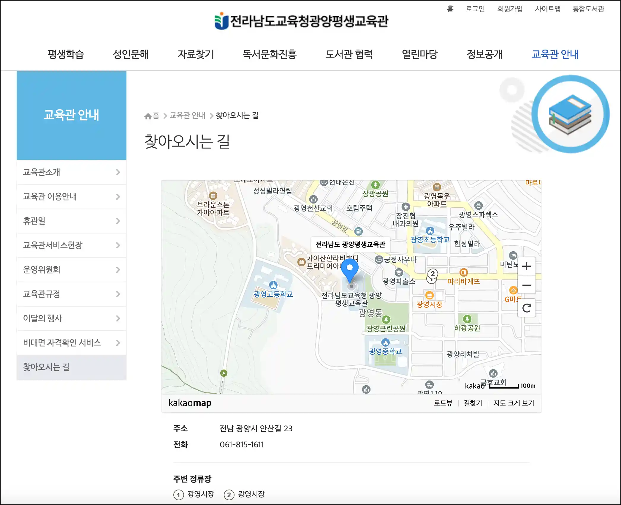 - 절차: 전라남도교육청 광양평생교육관 홈페이지에서 예비회원으로 등록 후, 신분증을 지참하여 교육관 내 자료열람실 방문하여 정회원으로의 전환 신청
