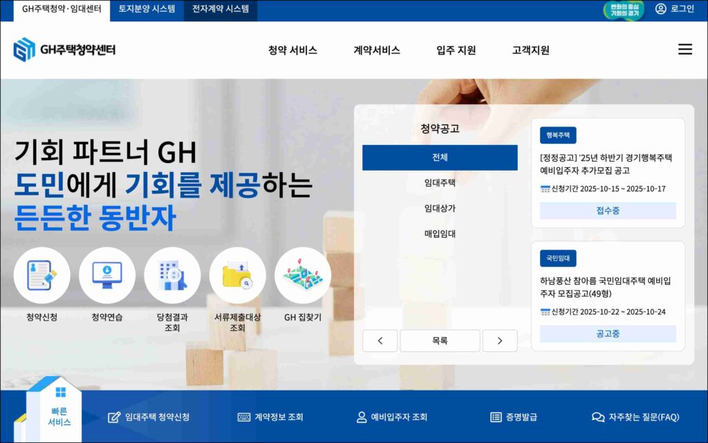 GH주택청약·임대센터는 경기도 주택도시공사에서 운영하는 온라인 청약 시스템으로, 경기도민을 위한 공공주택 신청과 임대 관련 업무를 처리하는 곳이에요. 사이트 주소는 apply.gh.or.kr이고, 경기도 내에서 진행되는 각종 주택 공급과 임대 사업을 한곳에서 확인하고 신청할 수 있도록 만들어졌습니다.